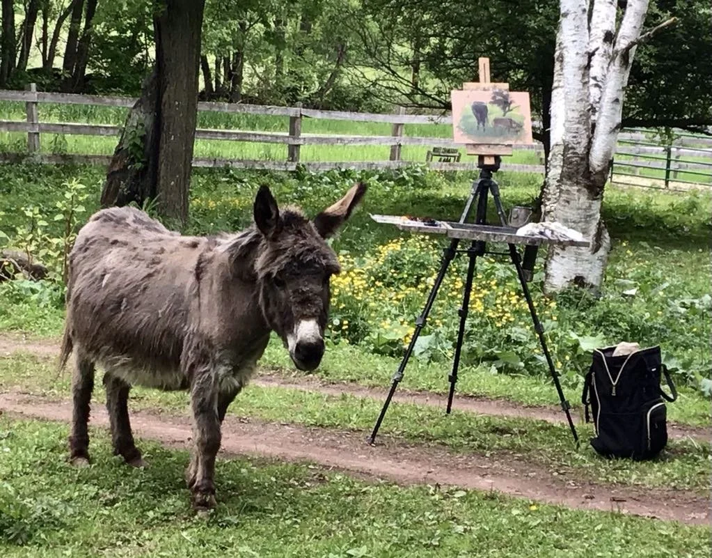Artists will work from designated locations with visibility to the horses, the farm and the landscape, some indoor, most outdoor. We will be creative in choosing a variety of locations that are both safe and interesting. Painting stations will be set up with unique access to our residents, including a ‘donkey station’, a buckboard and horse in gear, and wild horse viewing. There will also be some ’still life’ displays arranged with farm and equine equipment. If you want to paint from a spot that is not designated, ask and we will consider if at all possible. Artists may paint from more than one location each day. We will have equine handlers and staff moving horses from different spots throughout the day, allowing for multiple studies and photo opportunities to support continued studio work based on the weekend efforts.